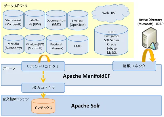 Apache ManifoldCFは、あらゆるデータソースを巡回(クロール)してコンテンツ情報やアクセス権限情報を自動的に取得し、Apache Solr、OpenSearchServer、Elasticsearchなどの全文検索エンジンの検索インデックスに登録します。