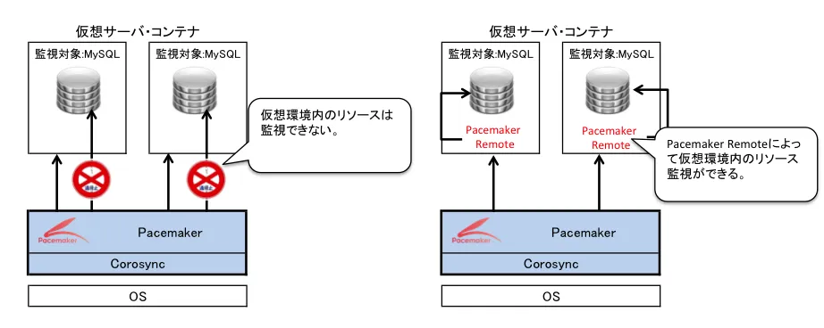 一方でクラスタソフトウェアとして有名なHeartbeatは2008年にクラスタ制御部:Heartbeat、リソース制御部:Pacemakerに分離されています。
