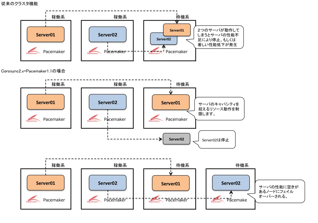Linux-HA Japanプロジェクト(コミュニティ)での推奨となっているCorosync2.xとPacemaker1.1の組み合わせの特徴は以下となります。