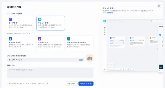 アプリタイプとして「チャットフロー」を選択し、アプリのアイコンと名前を設定した後、「作成する」ボタンを押します。