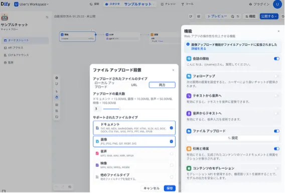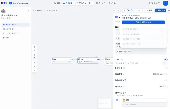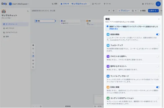 WebUI上のビジュアルワークフローが用意され、ノーコード/ローコードでAIアプリケーションを開発できます。