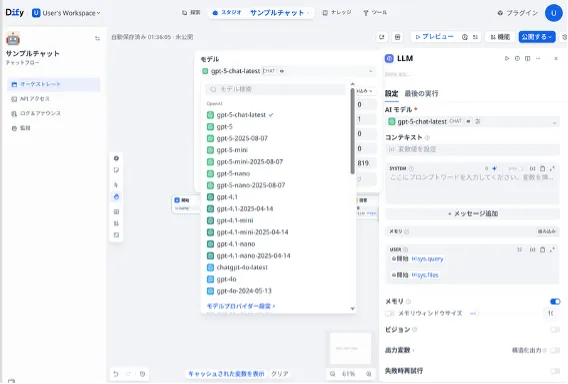 キャンバス上でLLMノードを選択し、LLMの設定画面からAIモデルを選択します。