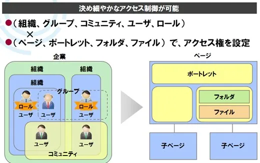 コンテンツ管理、情報ポータル、コラボレーションといった利用において、これらのグループ定義とアクセスコントロール機能を組み合わせることも可能です。