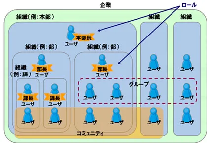 コミュニティやユーザグループは、本部や部、課といった縦型の階層化された組織に対して、組織横断型の組織を表しています。