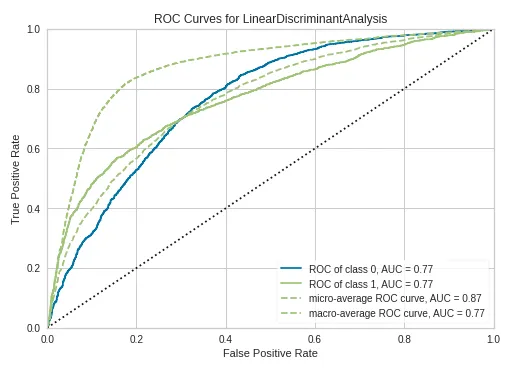 PyCaretは主要なグラフの表示も簡単にできます。例えば、ROC曲線は以下のようなコードで表示できます。
