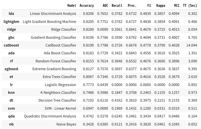 この関数は、モデルライブラリー内のすべてのモデルを学習し、メトリック評価のための層化交差検証を使用してそれらをスコアリングします。 出力は、学習時間とともに、精度、AUC、再現率、適合率、F1、Kappa、およびMCCを出力します。ここでは、LDAが最も高い精度を出したので、変数best_modelにはLDAのモデルオブジェクトが代入されます。