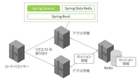 この例では、ロードバランサーで2つのSpring Bootアプリケーションにリクエストを振り分けています。どちらのアプリケーションもSpring Sessionによりセッションが生成・管理され、Spring Date Redisを経由して、Redisに永続化されます。セッションに関する情報はDBを介して2つのアプリケーションサーバー間で共有されることになり、一方で障害が発生した場合でももう一方のアプリケーションサーバーが動作していれば、継続してアプリケーションを利用できることになります。