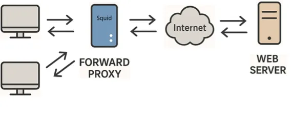 多くの場合、フォワードプロキシはクライアントと同一のネットワーク上に配置されます。クライアントが外部のWebサーバへリクエストを出す際にはクライアント側のプロキシ設定に基づきSquidにアクセスし、Squidがクライアントに変わってWebサーバにアクセスします。そうすることでSquidはWebサーバから取得したコンテンツをクライアントに返すと同時に自身のサーバ内にキャッシュします。これにより同一ネットワーク内の他のクライアントがSquid経由で同じWebページにアクセスした場合にSquidがキャッシュしたWebページの情報をクライアントに返すことができるようになります。