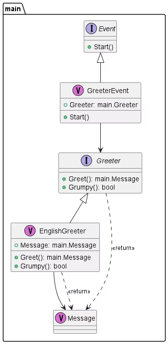 google/wireのサンプルを参考に下記に示すような構成において、Eventインタフェース型でインスタンスを受け取り、Startメソッドの実行を目指します。