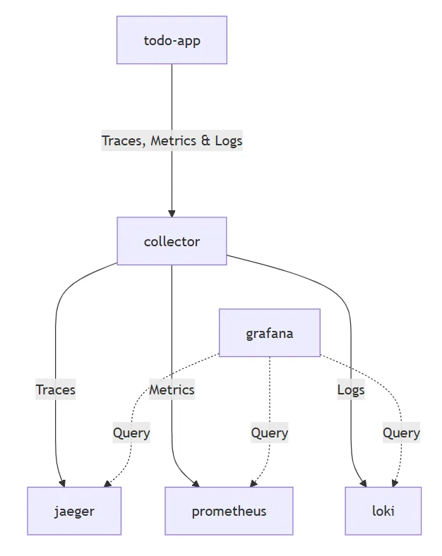 collectorはOpenTelemetryのコレクタのことです。jaeger、prometheus、loki、grafanaは、テレメトリデータを可視化するためのツールです。今回はトレース、メトリクス、ログのすべてを可視化できるGrafanaをメインで使っていきます。また、実線がテレメトリデータの流れを、破線がGrafanaのデータアクセスを表しています。