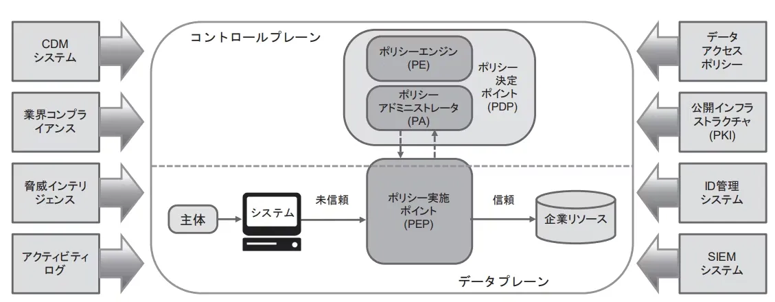 このPEP/PDPモデルについてNIST SP 800-207の「ゼロトラストの中核となる論理コンポーネント」を参考に簡単に説明します。