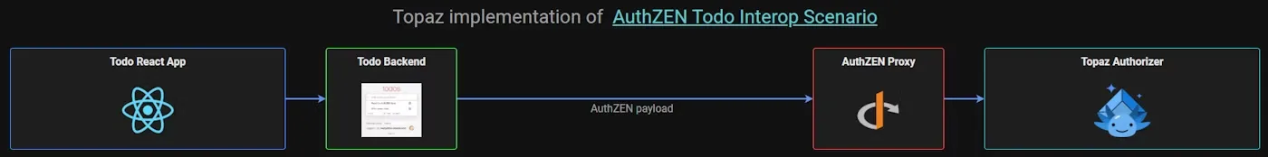 「Interop」という言葉は、「Interoperability」(相互運用性)の略で、一般的に異なるシステムが、円滑に連携し合い機能する能力を指します。本Interopでは、様々なPDPに対してevaluation APIを用いて、シンプルなTodoアプリケーションを例にその相互運用性を試すことができます。Todoアプリケーションの詳細な内容は本記事の趣旨から外れるため割愛しますが、簡単に言えば、異なるロールを持つ複数のユーザーが共同で利用するTodoサービスです。