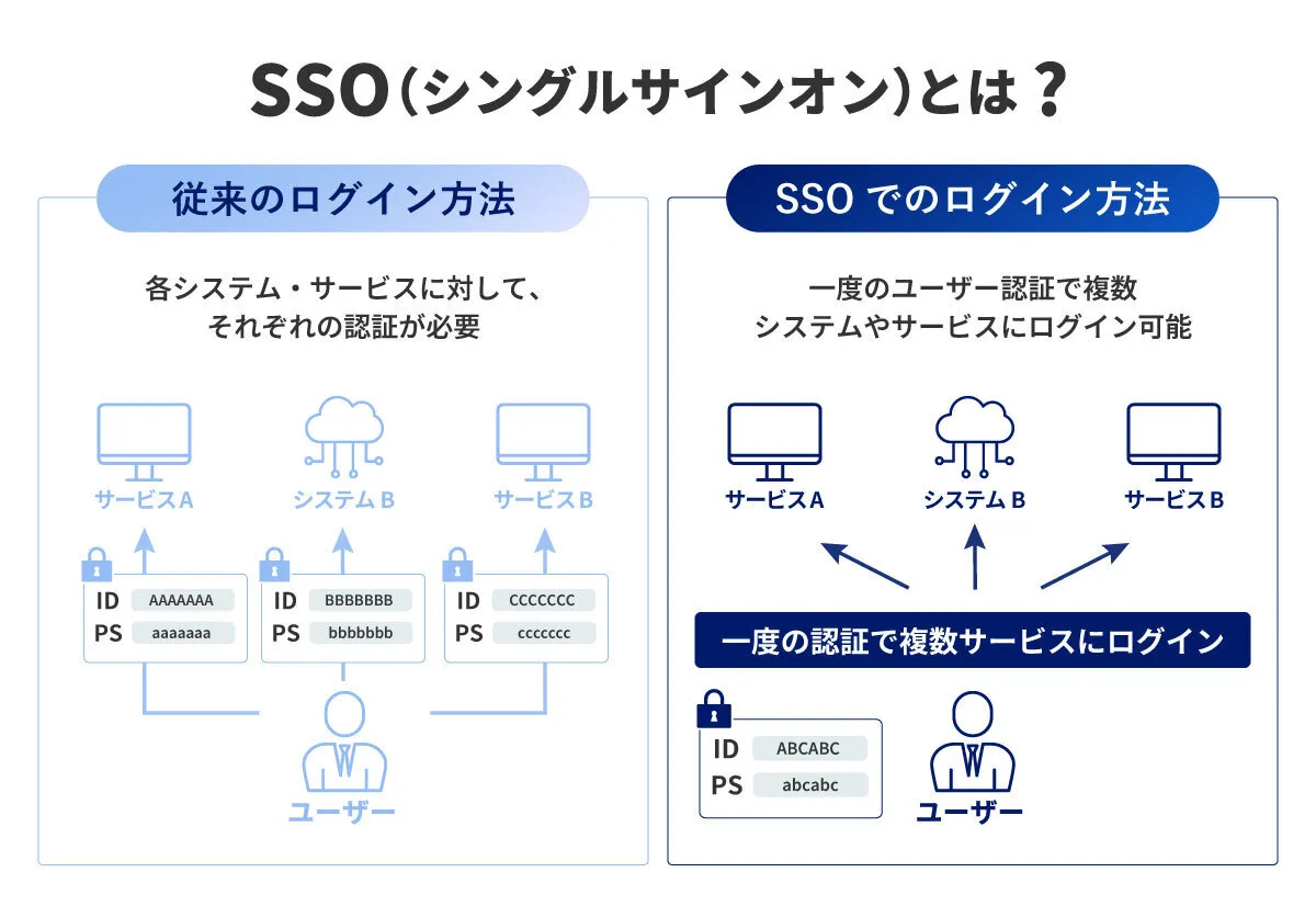 SSOは複数のサービスやシステムを利用している場合に、一度の認証で利用できるようにする仕組みです。SSOを導入することにより、ユーザーは何度もログインを行う必要がなくなります。