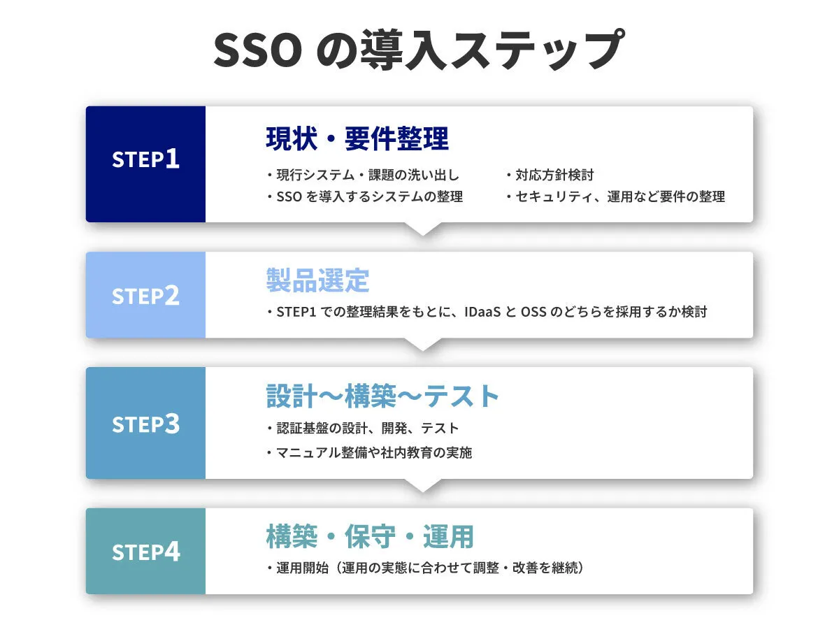 実際にSSOを導入する場合、どのようなことに注意すればよいのでしょうか。ここでは導入前の準備と、導入に必要な4つのステップについて、解説します。